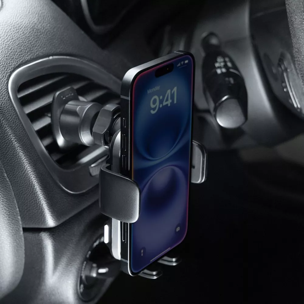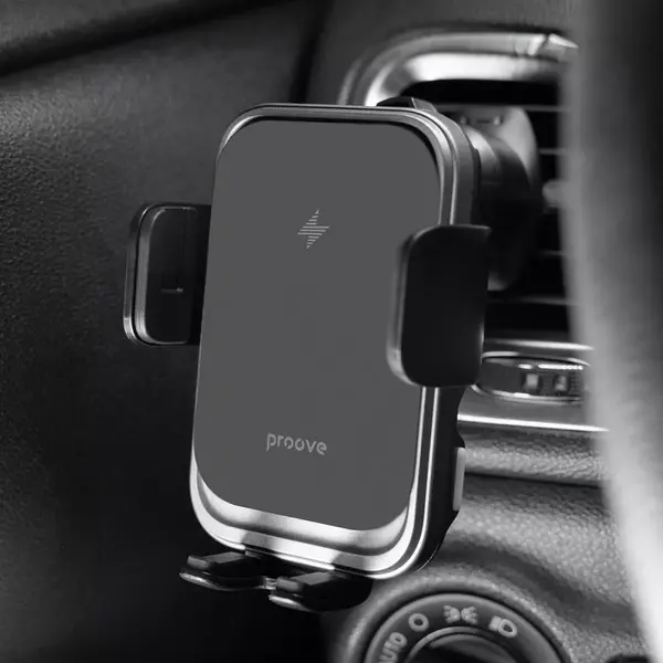 Proove Nitro Charge — простий спосіб заряджати телефон без дроту. Вставте гаджет у тримач, і зарядка розпочнеться. Прогумовані накладки фіксатора захистять смартфон від подряпин і автоматично зафіксують його у конструкції. Завдяки вбудованому акумулятору, телефон можна дістати навіть якщо авто вже заглушене. Щоб міцно закріпити тримач на вентиляційній решітці, скористайтеся механічним затискачем.