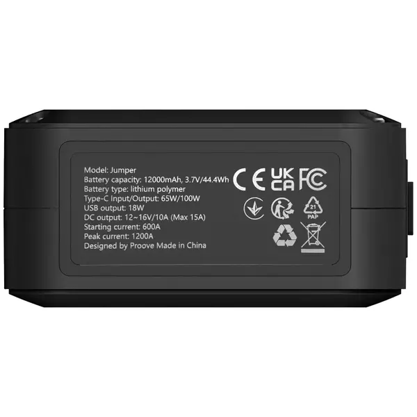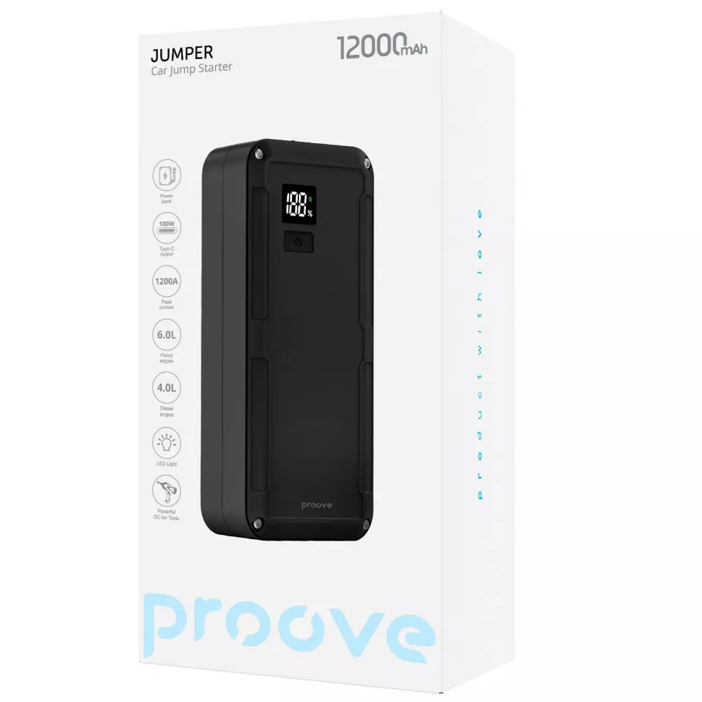 Виготовлений із високоякісного ABS-пластику, Proove Jumper має міцну та стильну оболонку, що забезпечує довговічність навіть у найскладніших умовах експлуатації. Завдяки акумулятору ємністю 12000 мАг (3.7V/44.4Wh) на базі літій-полімерної технології, пристрій гарантує потужність, необхідну для пуску двигуна із пусковим струмом 600А та піковим струмом до 1200А. Швидке зарядження через вхід Type-C потужністю 65W дозволяє Proove Jumper бути завжди готовим до використання.