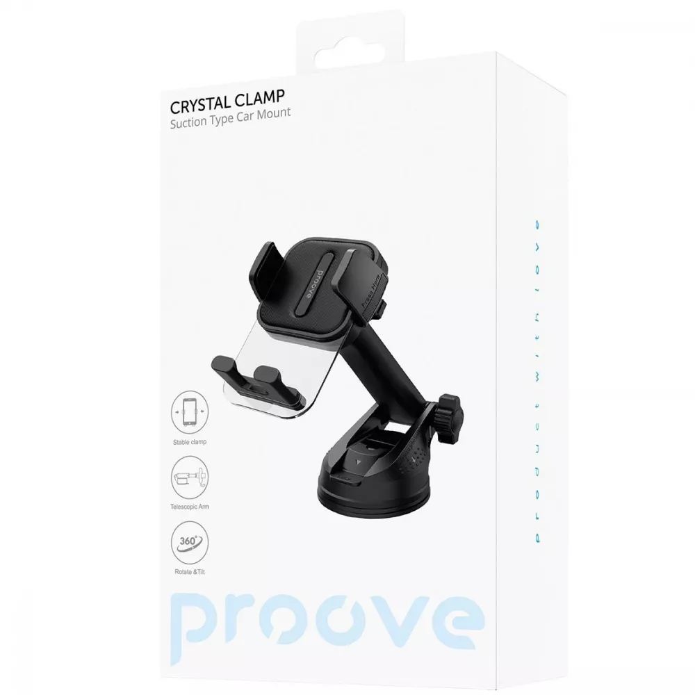 Proove Crystal Clamp встановлюється на рівну поверхність машини, наприклад панель керування. Регулюється завдяки телескопічній руці ви зможете налаштувати відстань до телефону так, як потрібно саме вам, а регулювання на 360 градусів дозволить обрати комфорте положення.