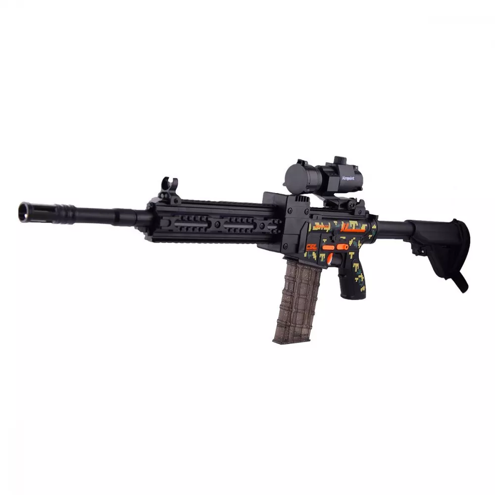 Іграшковий автомат M416 подарує купу задоволення від гри. Автомат зроблений у космічному дизайні, що дозволяє розкрити уяву дитини. Додаткову розвагу додає і реалістичний принцип роботи. Для гри треба самостійно зарядити магазин патронами з піни. Далі вставити його в автомат, налаштувати приціл та насолоджуватися грою.