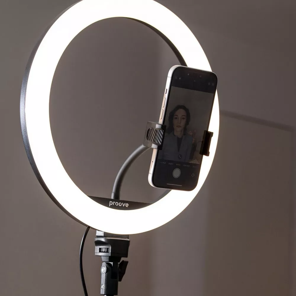 Proove Halo пропонує 17 режимів освітлення, які можна обрати залежно від ваших потреб, а також регулювання яскравості для створення ідеального освітлення. Смартфон легко розмістити в центрі світлодіодного кільця для створення якісних кадрів. У комплекті передбачено пульт дистанційного управління, який забезпечує максимальну зручність у використанні.