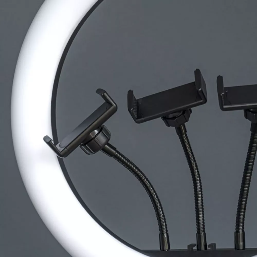 Кільце обладнано світлодіодними лампами, які випромінюють рівномірне і безпечне для очей світло. А його діаметр дозволяє охопити велику площу для зйомки.