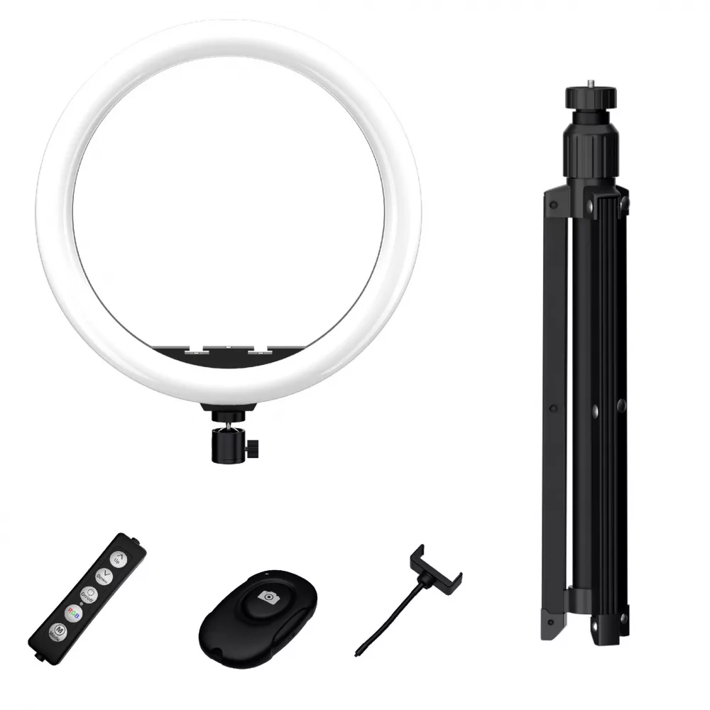 - комплект: кільцева LED-лампа, дистанційний пульт управління фото / відео, тримач для смартфона, кабель з європейським штекером, трипод;