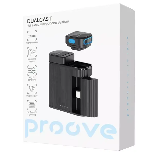 У комплекті передбачений зручний зарядний кейс, який дозволяє швидко підзаряджати мікрофони у будь-яких умовах. Компактні розміри та мала вага роблять Proove DualCast практично непомітним під час використання. Подвійна система мікрофонів ідеально підходить для запису діалогів, блогінгу, подкастів та онлайн-трансляцій, забезпечуючи комфортну та професійну роботу зі звуком.