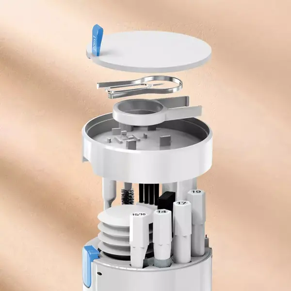 У комплекті: Кейс для зберігання х1, Велика висувна щіточка х1, Мікрофібра для чищення дисплея х1, Пиловидаляч х1, Подовжувач для пиловидаляча (короткий) х1, Подовжувач для аксесуарів х1, Спрей х1, Маленька жорстка щіточка х1, Маленька м'яка щіточка х1, Знімач кнопок клавіатури х1, Голка для виймання SIM-карт х1, Знімач клавіш клавіатури х1, Маленька вигнута щіточка х1, Ватна паличка х1, Щіточка для навушників х1, Наконечник х1, Коротка м'яка щіточка х1, Щіточка для зарядного кейса навушників х1, Щіточка для лінзи камери х1, Подовжувач для пиловидаляча (довгий).