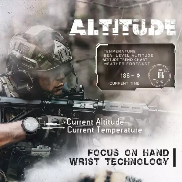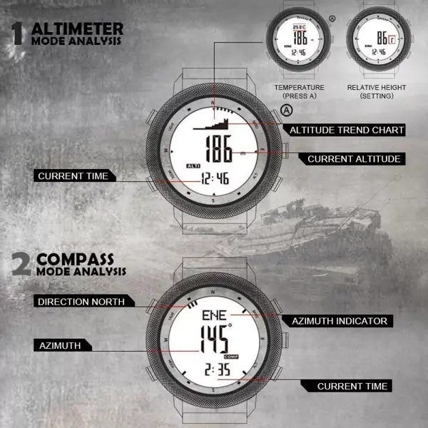 Режим компаса допомагає зорієнтуватися в незнайомій місцевості. Після первинного налаштування функції альтиметра та барометра годинник забезпечуватиме вас інформацією про висоту, на якій ви знаходитесь, атмосферний тиск і температуру, а також зможе розрахувати ймовірні погодні зміни.