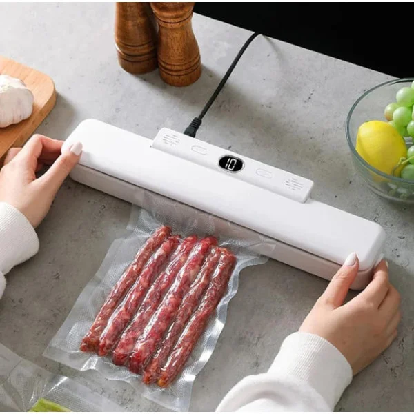 Вакуумний пакувальник для продуктів — пристрій, який видаляє повітря з пакету та герметично його запаює. Завдяки цьому продукти зберігають свіжість у 2–3 рази довше, не втрачають смак і не обвітрюються. Ідеально підходить для м’яса, овочів, фруктів, сиру та заготовок.
