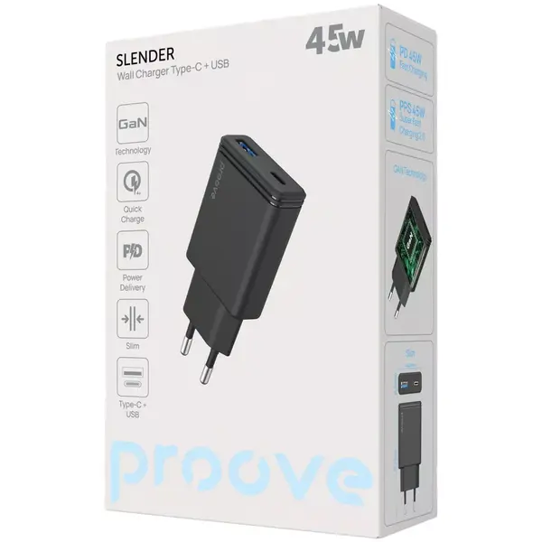 Proove Slender має тонкий корпус із вогнестійкого полікарбонату, який поєднує міцність і легкість. Компактні розміри дозволяють без проблем брати зарядний пристрій із собою. Він легко поміщається в сумці, рюкзаку чи навіть кишені. Лаконічний дизайн виглядає акуратно й доречно як удома, так і в офісі або під час подорожей.