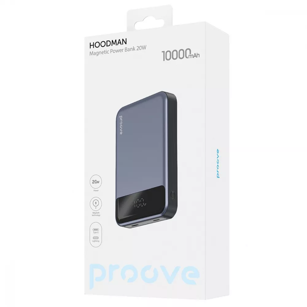 Proove Hoodman Magnetic сучасний девайс, що може зарядити ваш гаджет як за допомогою дроту, так і без. Повербанк обладнаний технологією MagSafe, що дає змогу зарядити айфон без жодного дроту, та портом Type-C, який дає змогу зарядити будь-який інший гаджет.