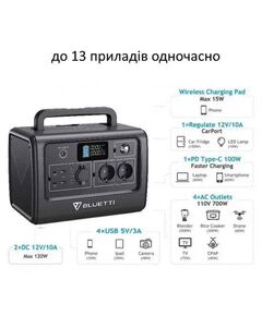 Характеристики: • Ємність: 572 Вт·год • Потужність: 600 Вт (пікова до 1200 Вт , X-Boost) • Батарея: LiFePO4 (до 3000 циклів ) • Зарядка від розетки: ~1 година • Зарядка від сонячної панелі: ~3,2 год • Зарядка від авто: ~6,5 год • Керування: Wi-Fi /...